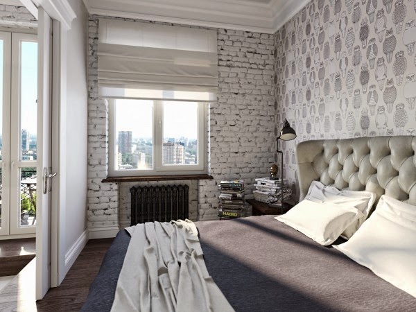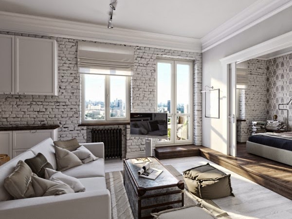 Mutfak duvarları dışında salonda beyaz tuğla duvarlar dikkat çekiyor. Zeminde de beyaz yüzey tercih edilerek tüm küçük alanlarda olduğu gibi geniş ve ferah bir mekan algısı yaratılmak istenmiş.