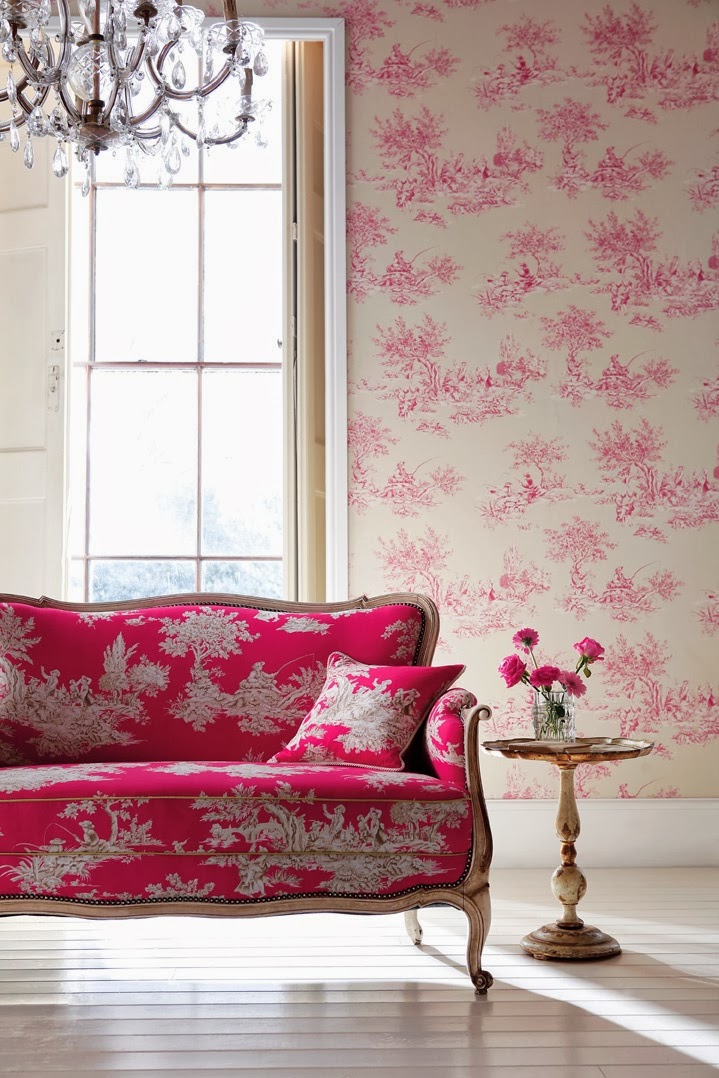 Klasik detaylarla fuşya gibi canlı bir rengi de son derece uyumlu bir şekilde kombine etmeniz mümkün. Fuşya desenli bir duvar kağıdı ve yine aynı renk koltuğun yer aldığı bu salonda kendinizi özel hissedeceksiniz.