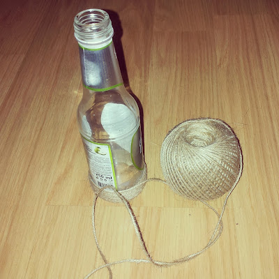 İpi de aldığıma göre şişeleri sarmaya başlayabilirdim. Tabii vakit bulabilirsem. İşte bu akşam kendin yap projesini hayata geçirmek için vakit buldum ve çok dekoratif bir şişe sahibi oldum. 🙂