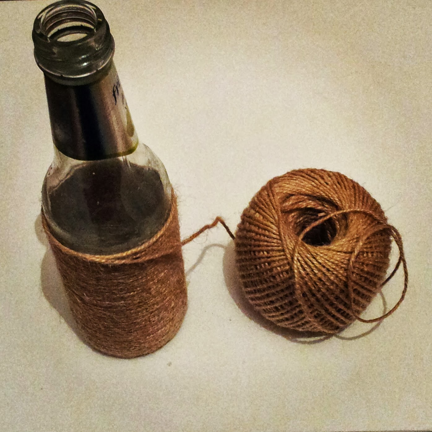Kına gecesi hediyesi yapmak için Eminönü’ne malzeme almaya gittiğimizde hasır ip de aldım. Aklımın bir köşesinde internette örneklerine rastladığım iplerle sarılı şişeler vardı. İçtiğim sodaların şişelerini bir köşede biriktirmeye başlamıştım zaten. Tek eksiğim ipti. 🙂
