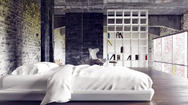 Urban loft evin yatak odasında da kullanılan tek renk beyaz. Yatak olarak Japon stili, yere yakın yatak tercih edilmiş. Onun dışında asma katta salondaki kitaplığın devamı ve bir de berjer yer alıyor.